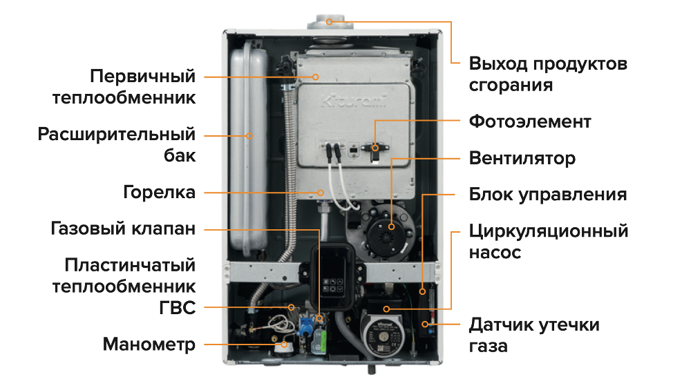 Термостат находится в комнате и постоянно измеряет температуру воздуха. Когда становится холодно, трехходовой клапан переходит в режим «отопление». Включается циркулярный насос, который начинает «гонять» воду по отопительному контуру. Затем открывается газовый клапан, зажигается горелка. В теплообменнике энергия от сгорания газа нагревает воду, которая протекает через него. Встроенные манометр и термометр измеряют температуру, до которой нагрелась жидкость, а также ее давление.