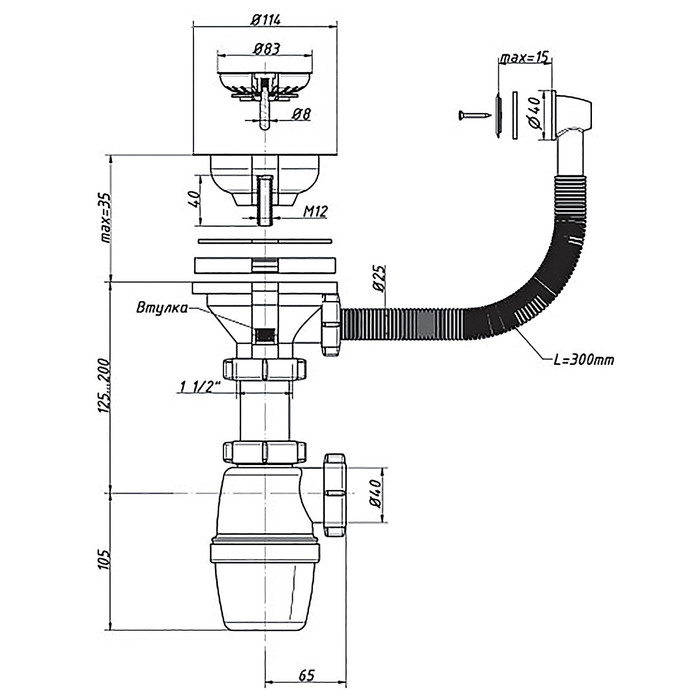 Сифон бутылочный с выпуском 3 1/2"х40 с переливом,с решеткой из нержавеющей стали D-114мм, предназначен для использования в кухонных мойках. Высота гидрозатвора составляет 60мм, что соответствует гигиеническим нормам. Сливное ответстие из корпуса сифона имеет отверстие D-40мм и снабжено механизмом цангового зажима с использованием конической прокладки. Материал полипропилен.