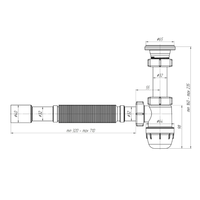 Сифон "АНИ ЮНГ" BM1015 1 1/4x32 с гибкой трубой 32x32x40 для умывальника бутылочного типа с уменьшенным корпусом. С нержавеющей решеткой 65 мм. Выход для подключения к канализации 32 мм.