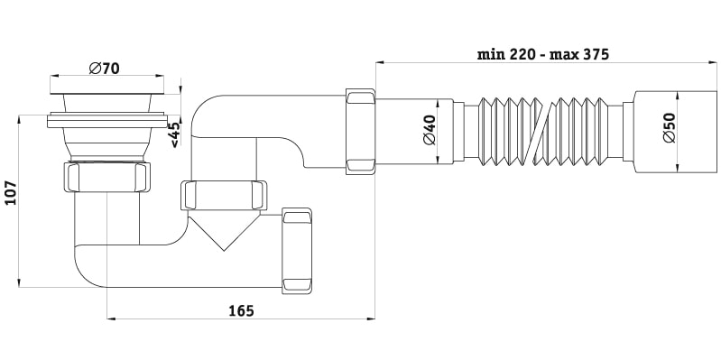 Сифон Ани для душевого поддона регулируемый 1 1/2"*40 с гибкой трубой 40*50 Габаритные размеры 202*115*74 Материал горловины - сталь.
