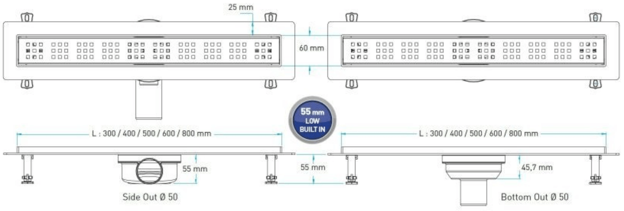 Трап для душа STARLINE BASE 70см с решеткой и опорами, с регулируемым на 360° отводом d 50mm, сух. затвор, VALTEMO